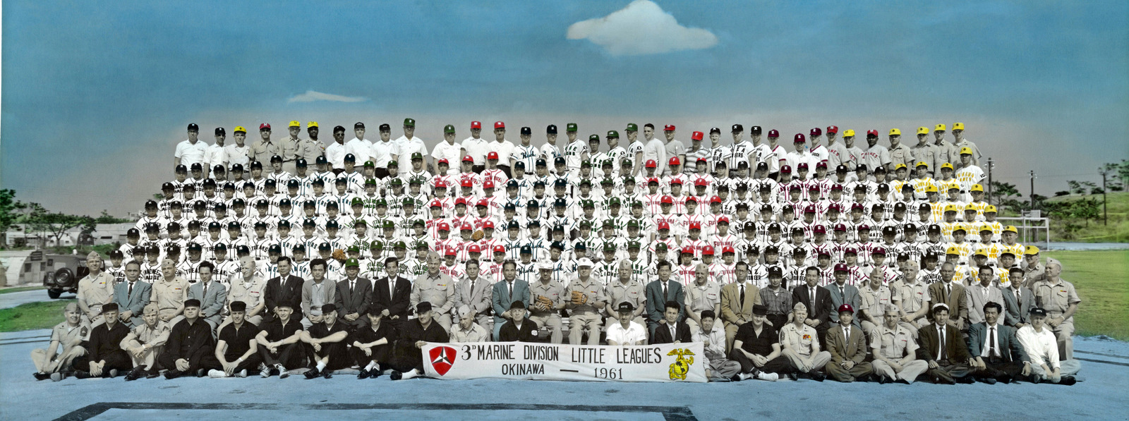 Blackie did a lot of military unit photos which were usually sold framed, these were generally 19 inches by 7.5 inches in black and white and colored by hand. One of the more unusual unit photos was the 3rd Marine Division sponsored Okinawan Little League baseball teams. This photo was for the 1961 teams which consisted of: